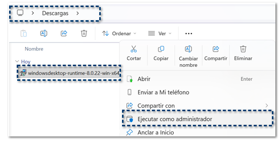 Una vez descargado el archivo, ve a la ruta de descargas de tu equipo, identifica el instalador; haz clic derecho sobre el y ejecuta como administrador.