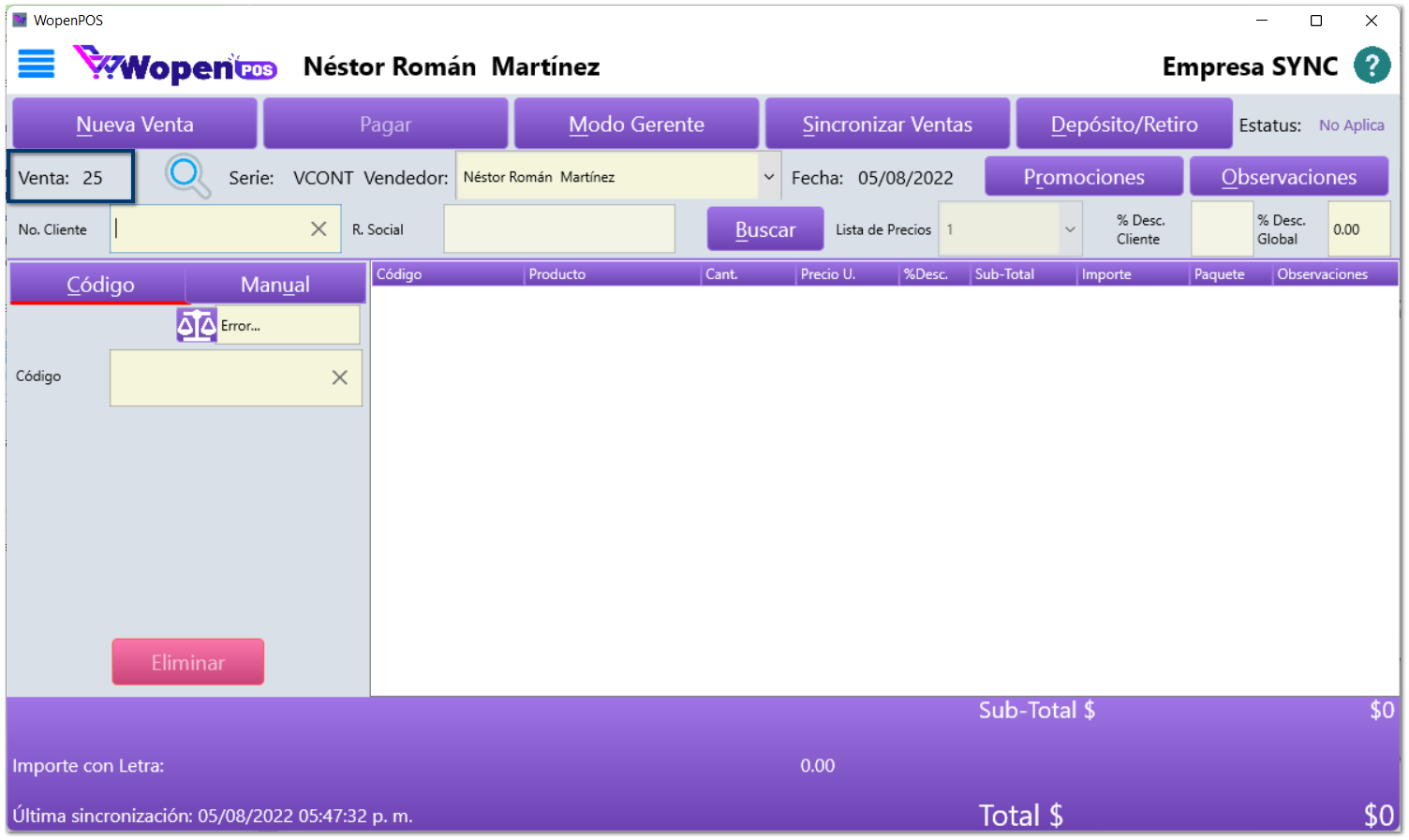 En la siguiente imagen, se puede ver que después de accionar la combinación de teclas CTRL + N, el sistema limpia la pantalla y coloca el consecutivo del documento, para que comiences a capturar la nueva venta, tal como si hubieras presionado el botón Nueva venta.