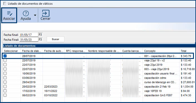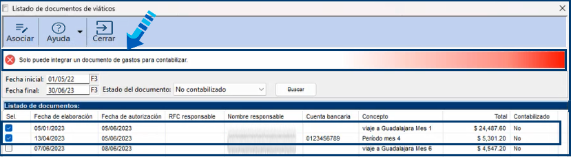 Para eliminar el mensaje anterior deberás seleccionar sólo un documento de gastos y presionar el botón Asociar:
