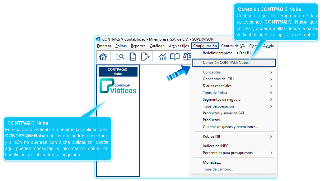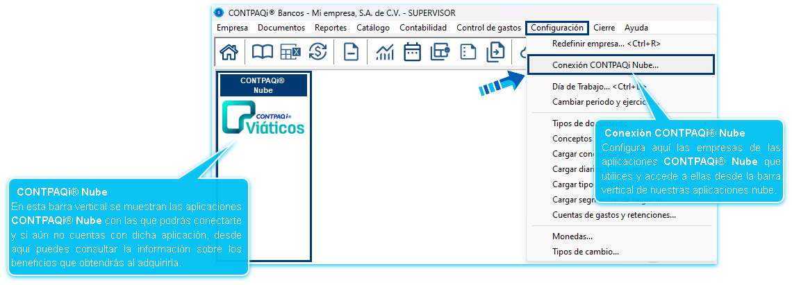 Podrás entrar al módulo "Conexión CONTPAQi Nube®" desde el menú Configuración, ya sea desde CONTPAQi Contabilidad® o CONTPAQi Bancos®: