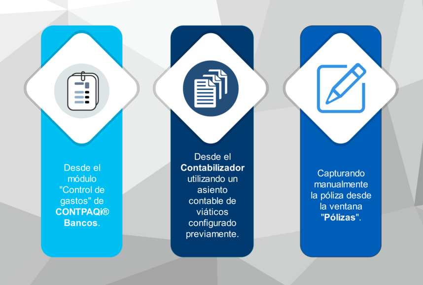 Que el proceso de contabilización de los gastos y viáticos se adapte al flujo y operación natural del contador o usuario, permitiendo hacerlo directamente desde CONTPAQi Contabilidad® ya sea desde la ventana de pólizas o en el Contabilizador, así como desde el módulo Control de gastos de CONTPAQi Bancos®.