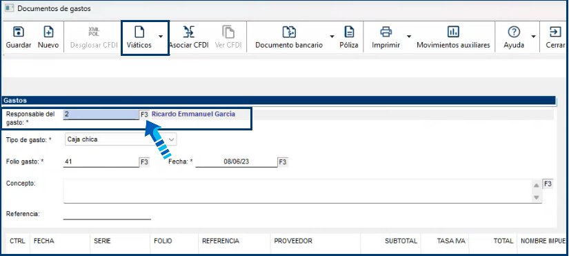 Captura o asigna desde el botón "F3" al responsable de gasto, con esto se habilitará el botón "Viáticos":