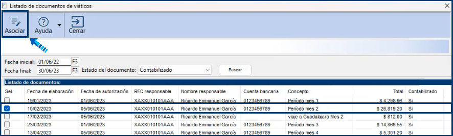 Se desplegará el listado de documentos de viáticos para que identifiques el documento que deseas contabilizar, haz clic en el registro deseado y presiona el botón Asociar: