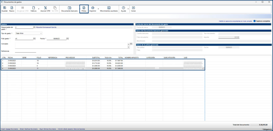 Una vez asociado el documento podrás observar su información en la sección del detalle de movimientos que se muestra en la parte inferior; captura la información faltante del gasto en la parte superior izquierda de éste y haz clic en el botón "Póliza" para generar su póliza correspondiente como lo haces de manera habitual.