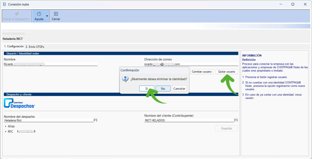 Con esta opción podrás eliminar la identidad asignada en la configuración del usuario, al hacer clic en el botón "Quitar usuario" se te pedirá que confirmes si realmente deseas eliminar la identidad, para continuar presiona el botón "Si", de lo contrario presiona "No" o "Cancelar".