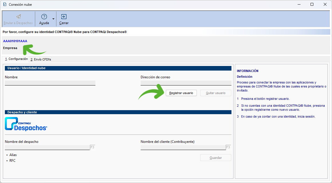 Al presionar el botón "Sí", se elimina el usuario, mostrando el RFC de la empresa y se habilita el botón "Registrar usuario" para que vuelvas a registrarlo: