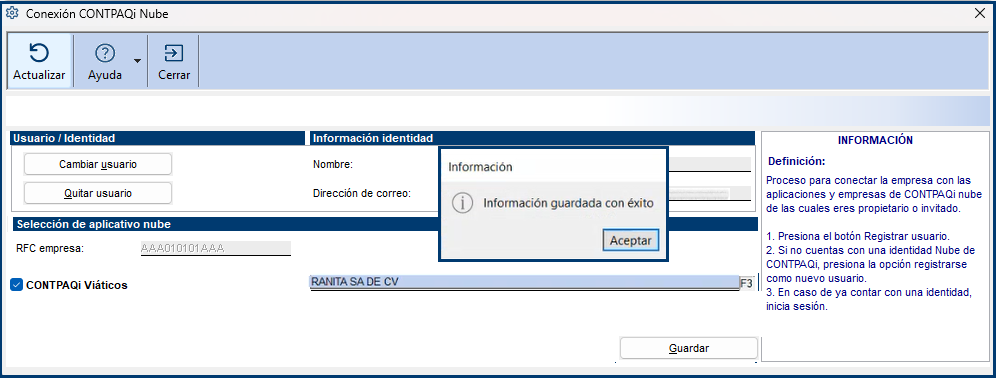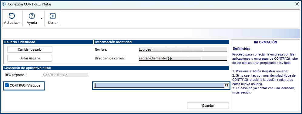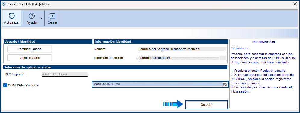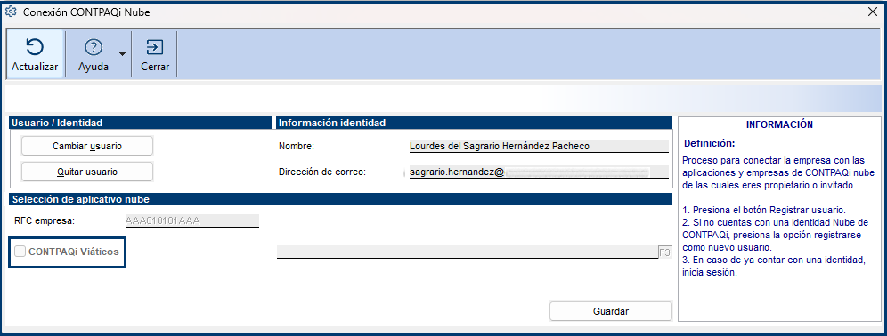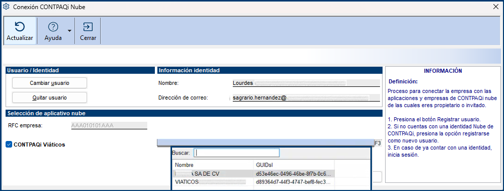 Únicamente se mostrarán las empresas que tengan el mismo RFC en CONTPAQi Viáticos® y CONTPAQi Contabilidad® y CONTPAQi Bancos®, es decir, el RFC que se muestra en la ventana Conexión CONTPAQi Nube®.