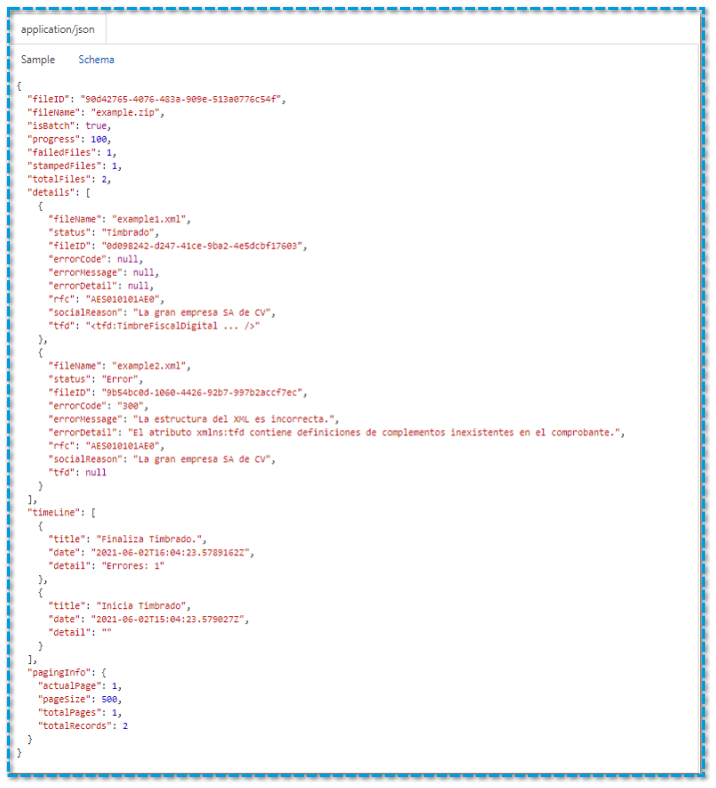Una vez que hicimos la solicitud para consultar el estado de nuestra petición de timbrado, obtendremos como respuesta varios campos como se muestran a continuación: