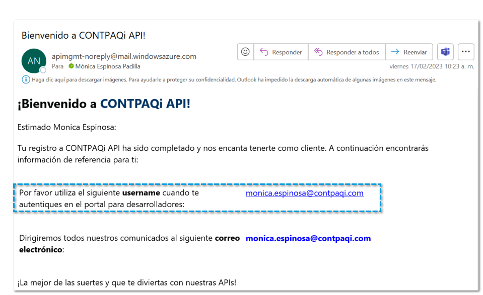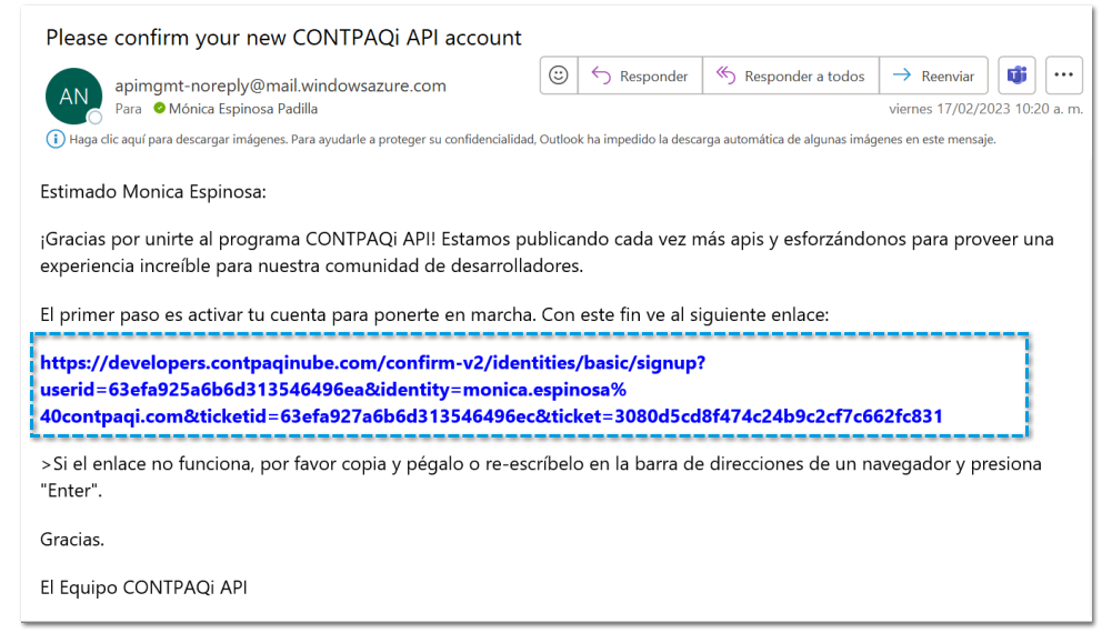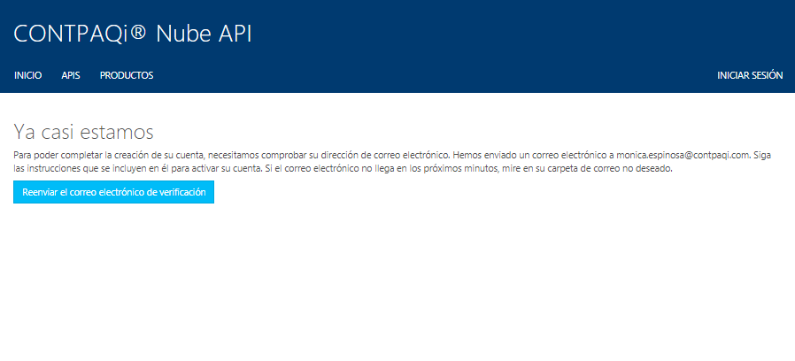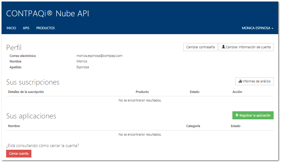 El enlace te lleva a la ventana del perfil de tu nueva cuenta CONTPAQi® Nube API: