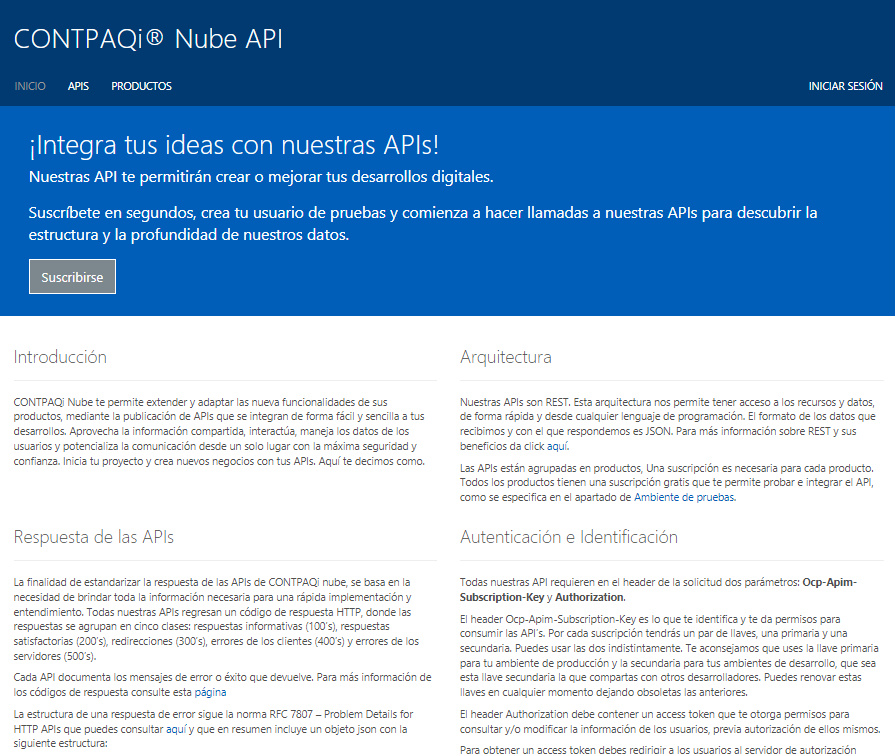 Ingresa a la liga:https://developers.contpaqinube.com/, y se abrirá el explorador de internet mostrando la ventana de Inicio, en la cual encontrarás la información general de las APIs CONTPAQi®, tal como la arquitectura, respuesta, autenticación e identificación, versionamiento, límite de peticiones, seguridad de las "APIs, así como la opción para registrarte y crear una cuenta CONTPAQi® Nube API.