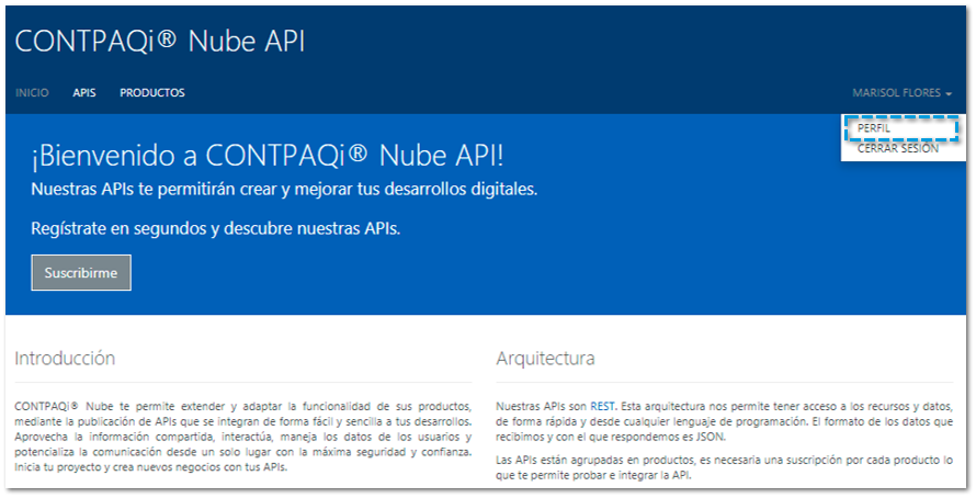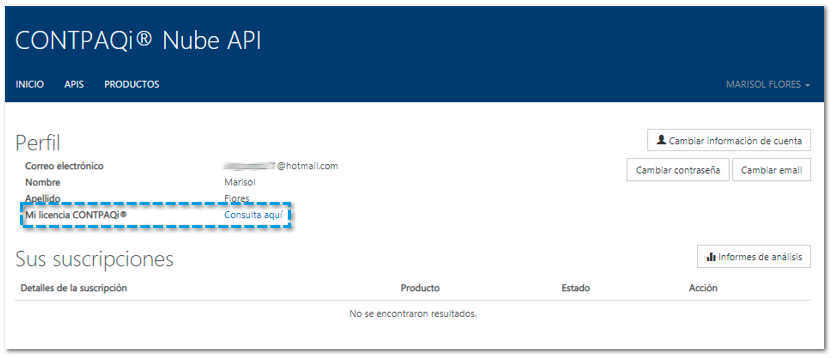 Se mostrará la información de tu perfil dentro del portal desarrolladores, donde podrás acceder a la información de tu licencia CONTPAQi® Nube, haz clic en el vínculo Consulta aquí.