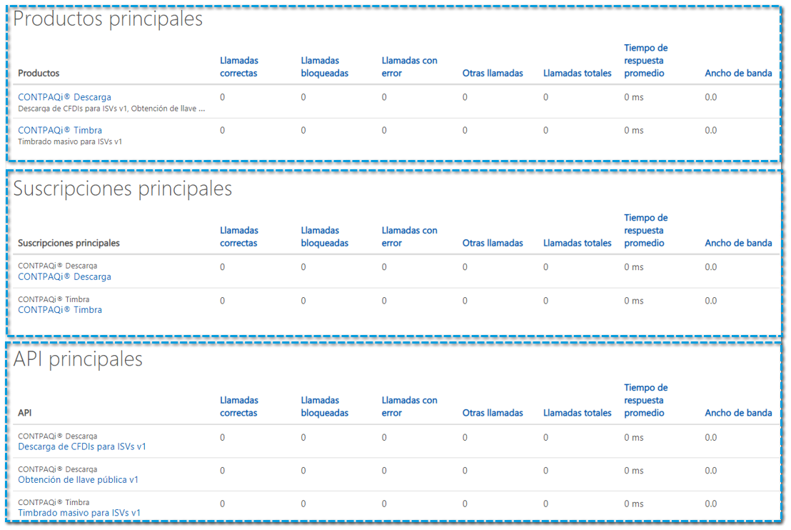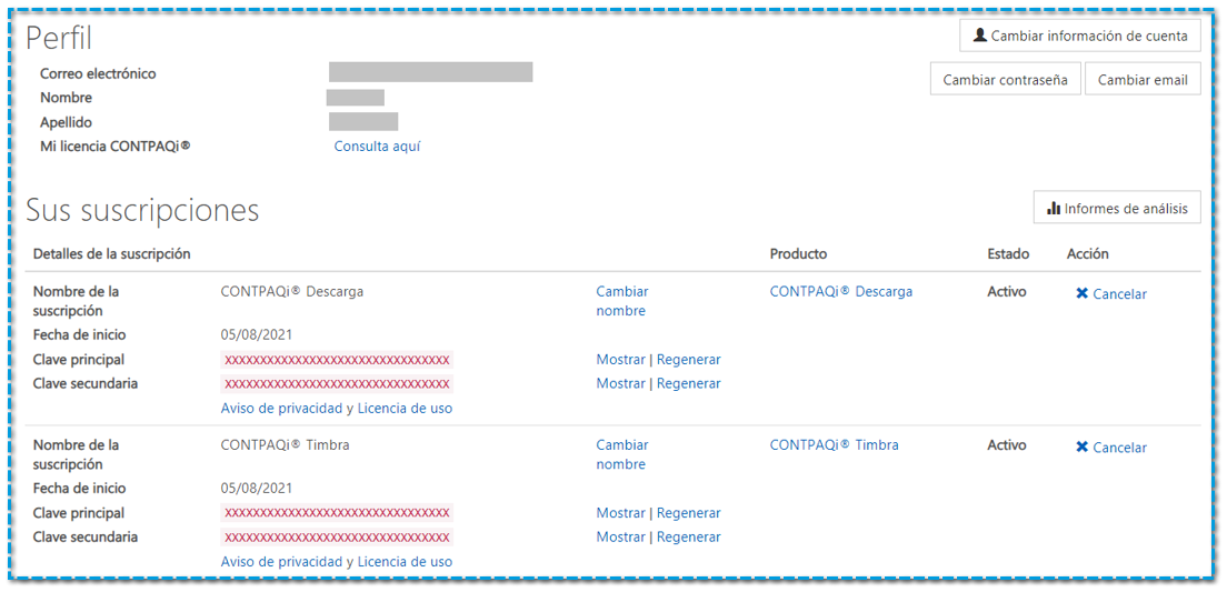 , podrás encontrar la información de tu cuenta, suscripciones, claves o subscriptionkey e informes generales de consumo.